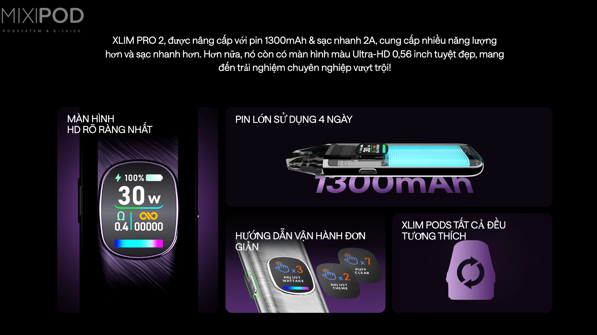 Dễ Dàng Sử Dụng và Bảo Quản: Xlim Pro 2 được thiết kế với mục tiêu mang lại sự tiện lợi tối đa cho người dùng. Các thao tác lắp đặt, sạc pin, thay coil đều rất đơn giản và nhanh chóng.