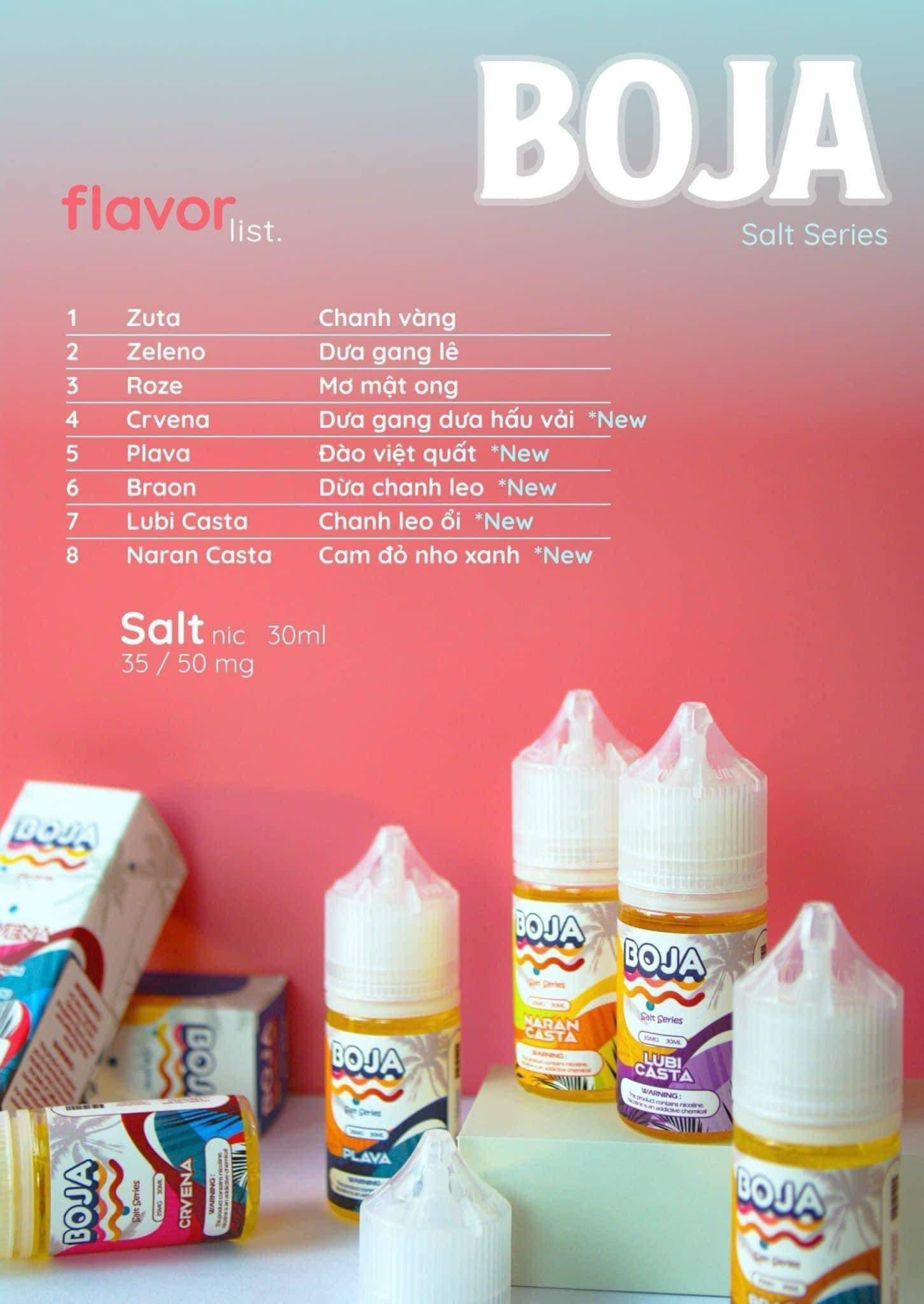 Ra mắt anh em vaper chỉ với 3 dòng hương vị gồm: Boja Juice Chanh muối lạnh; Boja Juice Dưa Gang Lê lạnh và c. Mới đây, Boja Juice tái xuất thị trường với bước đột phá gồm 5 hương vị mới gồm: Boja Juice Nho xanh Cam đỏ; Boja Juice Dưa gang Dưa hấu Vải; Boja Juice Dừa Chanh leo; Boja Juice Ổi Chanh leo và Boja Juice Đào Việt quất.