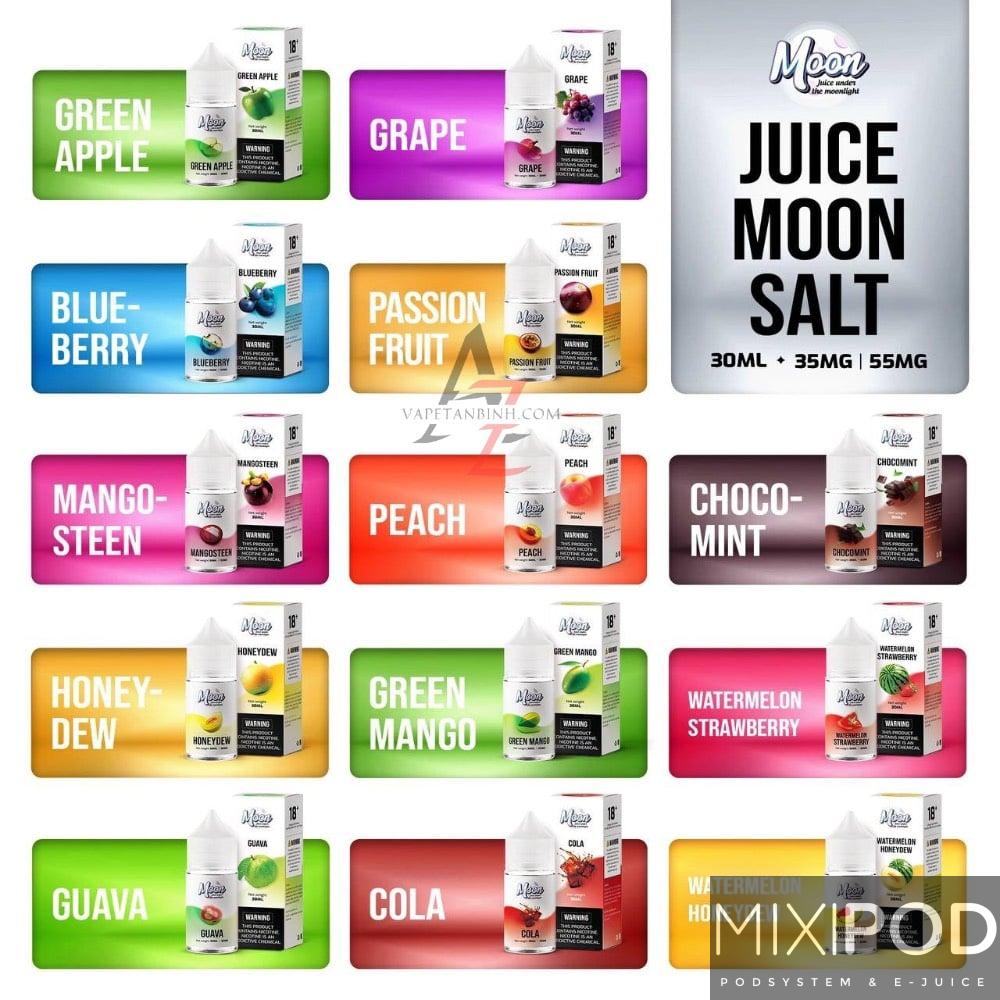13 hương vị trái cây chiết xuất tự nhiên, đậm đà mát lạnh, chất juice bền bỉ trong mỗi chai tinh dầu của Moon Juice đảm bảo thỏa mãn nhu cầu vaping của mỗi cá nhân. Tùy theo sở thích, cá tính, mỗi vaper khi kết hợp với Xlim pro có thể lựa chọn cho mình một hương vị khác nhau của Moon Salt để trải nghiệm. Bảng hương vị của Moon gồm đầy đủ các loại juice trái cây vị đơn và mix vị như: