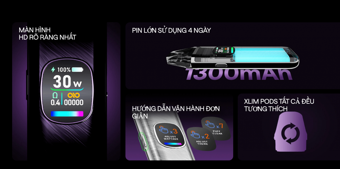 Điều này đặc biệt có lợi cho những người luôn di chuyển hoặc có lối sống bận rộn. Công suất đầu ra tối đa 30W giúp mang lại trải nghiệm pod system mạnh mẽ với các thiết lập tùy chỉnh.