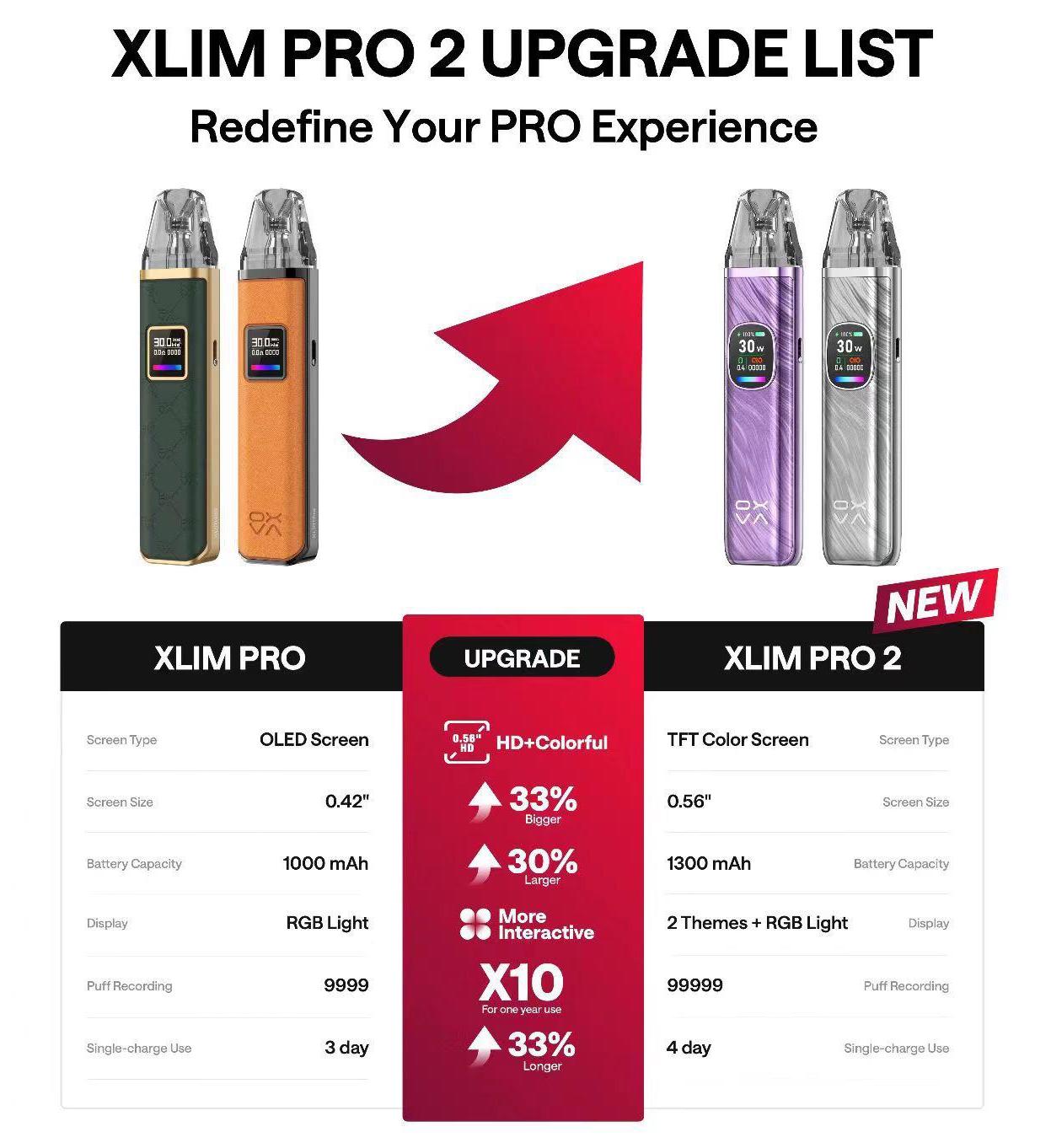 Bộ Kit Oxva XLIM PRO 2 có thiết kế pod nâng cấp giảm đáng kể nguy cơ rò rỉ tinh dầu. Đầu rỗng Xlim Pro 2 mới tương thích với tất cả các thiết bị Xlim (trừ Xlim C) và mang lại trải nghiệm hương vị chân thực hơn. Sự cải tiến thiết kế này làm cho thiết bị đáng tin cậy hơn và nâng cao trải nghiệm vaping tổng thể cho anh em