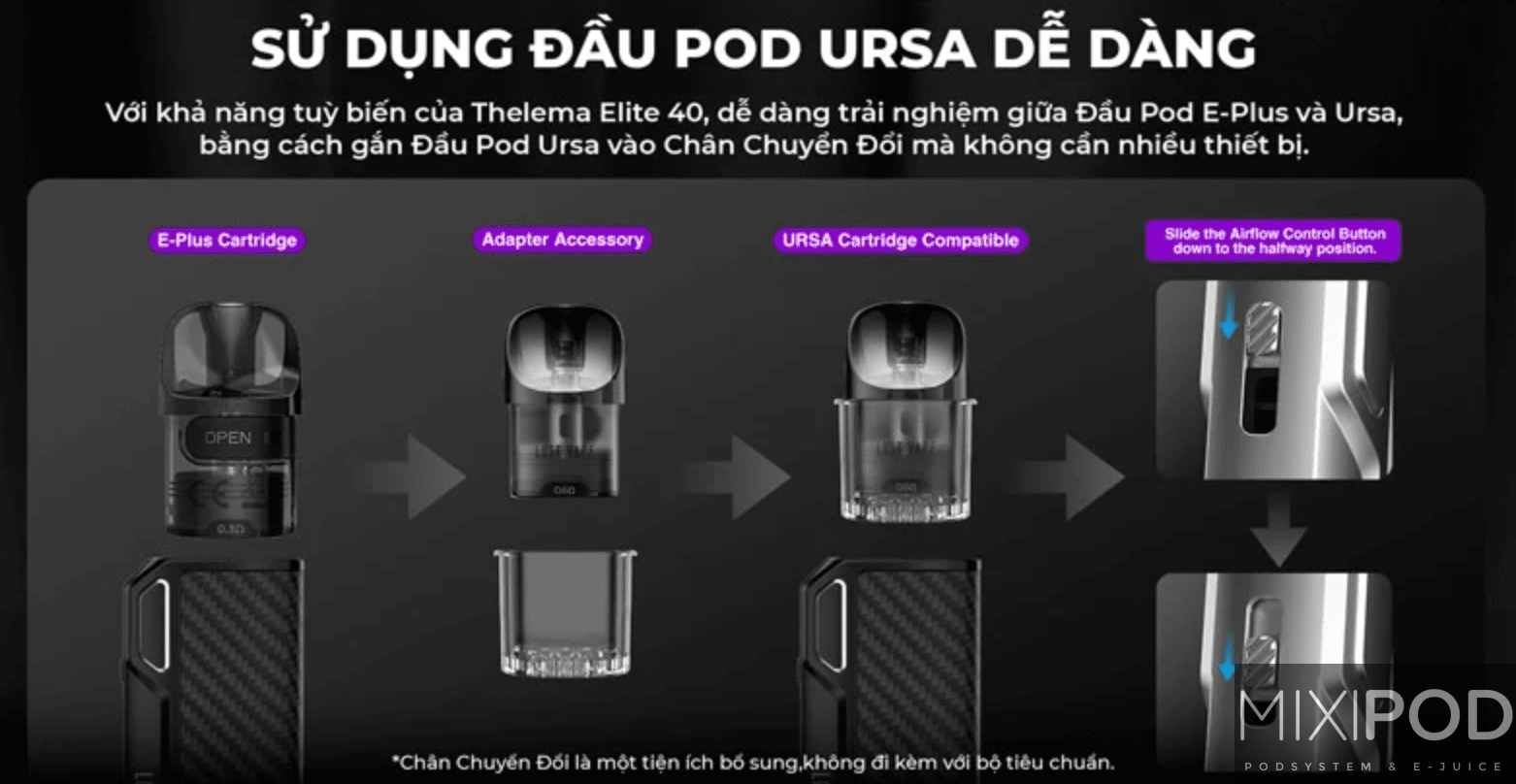 Dung pod lên đến 3ml là điều tuyệt vời giúp anh em yên tâm vping lâu hơn. Việc châm tinh dầu cũng được thự hiện dễ dàng hơn nhờ cổng châm tinh dầu Side Fill. Đồng thời, điểm ấn tượng của máy là khả năng tương thích với nhiều loại đầu Pod URSA. Tuy nhiên điều này không có sẵn mà là nhờ vào một số phụ kiện bộ chuyển đổi Adapter
