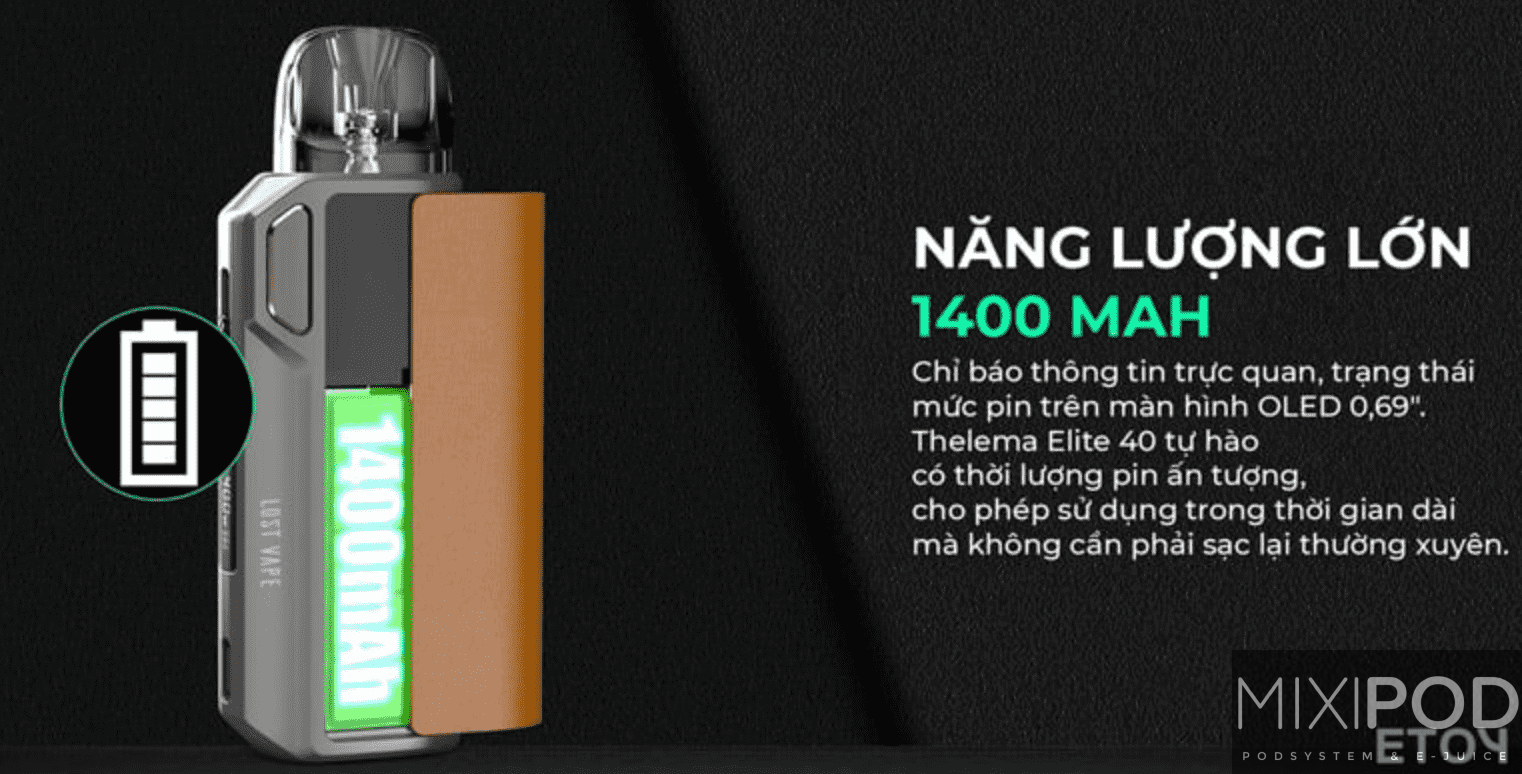 Lost Vape Thelema Elite 40 Pod Kit là một thiết bị Pod System của nhà sản xuất Lost Vape, mới được trình làng vào năm nay. Theo giới sành khói, sản phẩm được thiết kế với vẻ ngoài vô cùng ấn tượng, toát lên sự sang trọng, các chức năng bên trong cũng đáp ứng đa dạng nhu cầu người dùng khi có công suất lên đến 40W cùng dung tích Pin khủng 1400mAh. Chưa hết, phần đầu Pod sử dụng công nghệ mới E Plus, tùy biến coil theo ý thích của người dùng. Với những thú vị hư vậy, sản phẩm hứa hẹn sẽ trở thành được săn lùng nhất 2024