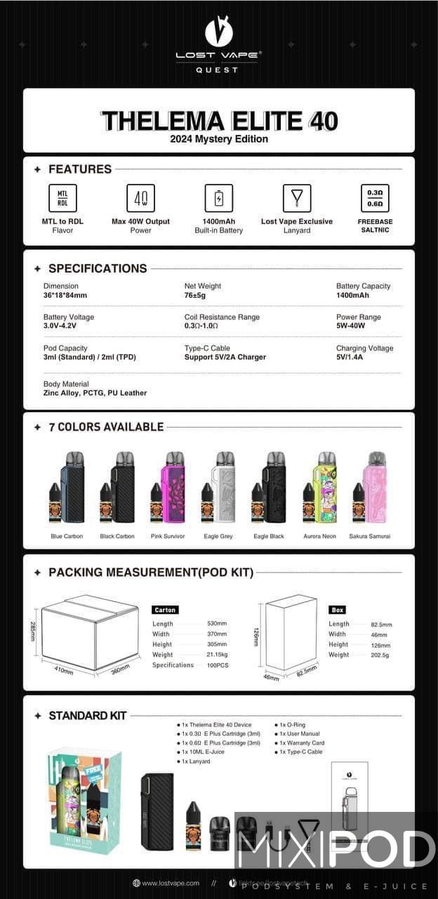 Thông số kỹ thuật của Lost Vape Thelema Elite 40W Pod Kit