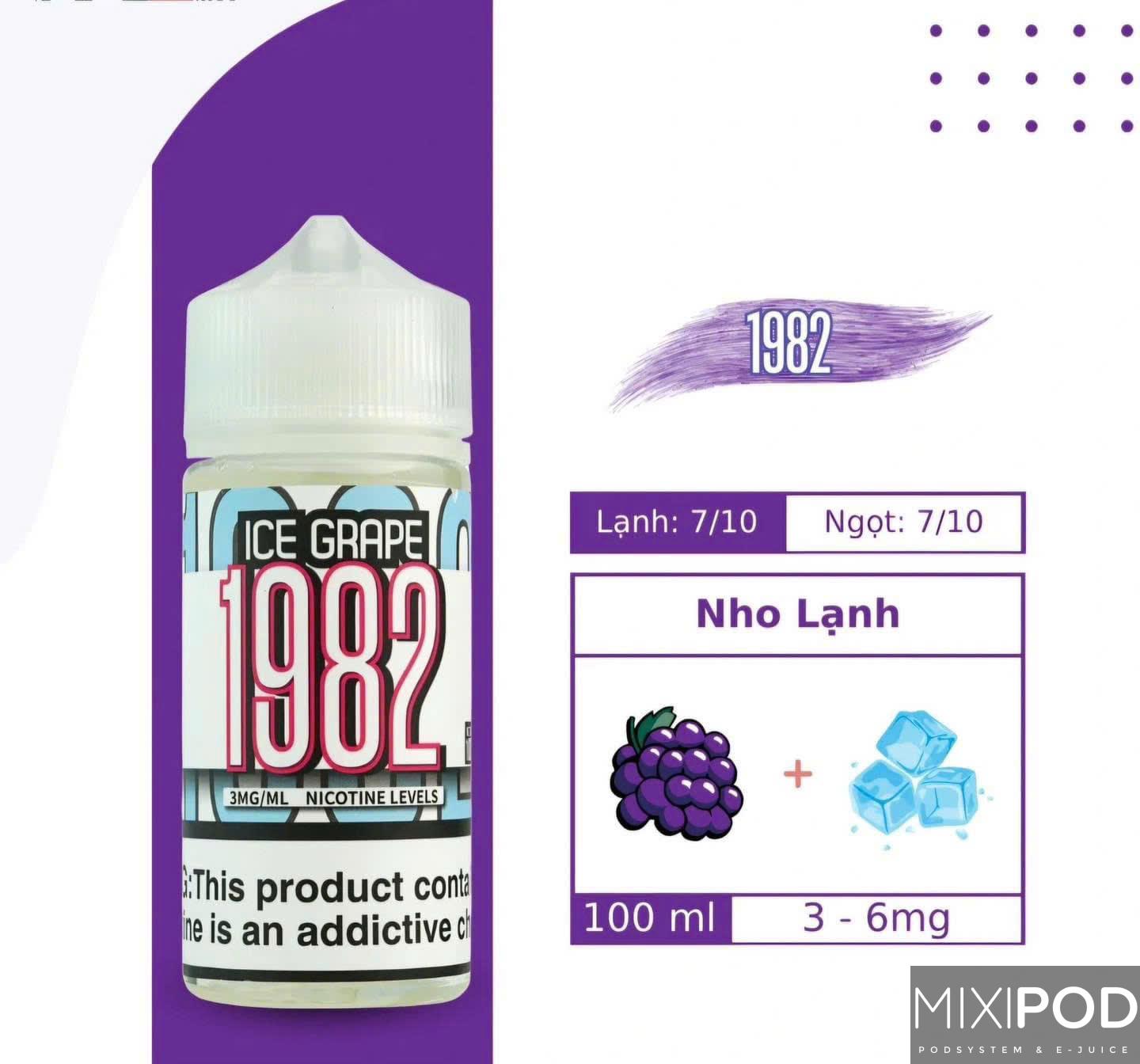 Nhắc đến 1982 chắc hẳn anh em đồng khói không ai là không biết đến độ nổi tiếng, đẳng cấp của thương hiệu này trong ngành công nghiệp tinh dầu vape. Và nhắc đến 1982, nhiều anh em sẽ nhớ ngay đến chai Juice 1982 Freebase Ice Grape – vị nho lạnh đặc trưng của thương hiệu này. Từ một hương vị nho lạnh độc bản, 1982 Freebase đã phát triển vượt bậc khi sáng tạo thêm những hương vị juice mới lạ đưa vào danh sách các sản phẩm đẳng cấp của mình.