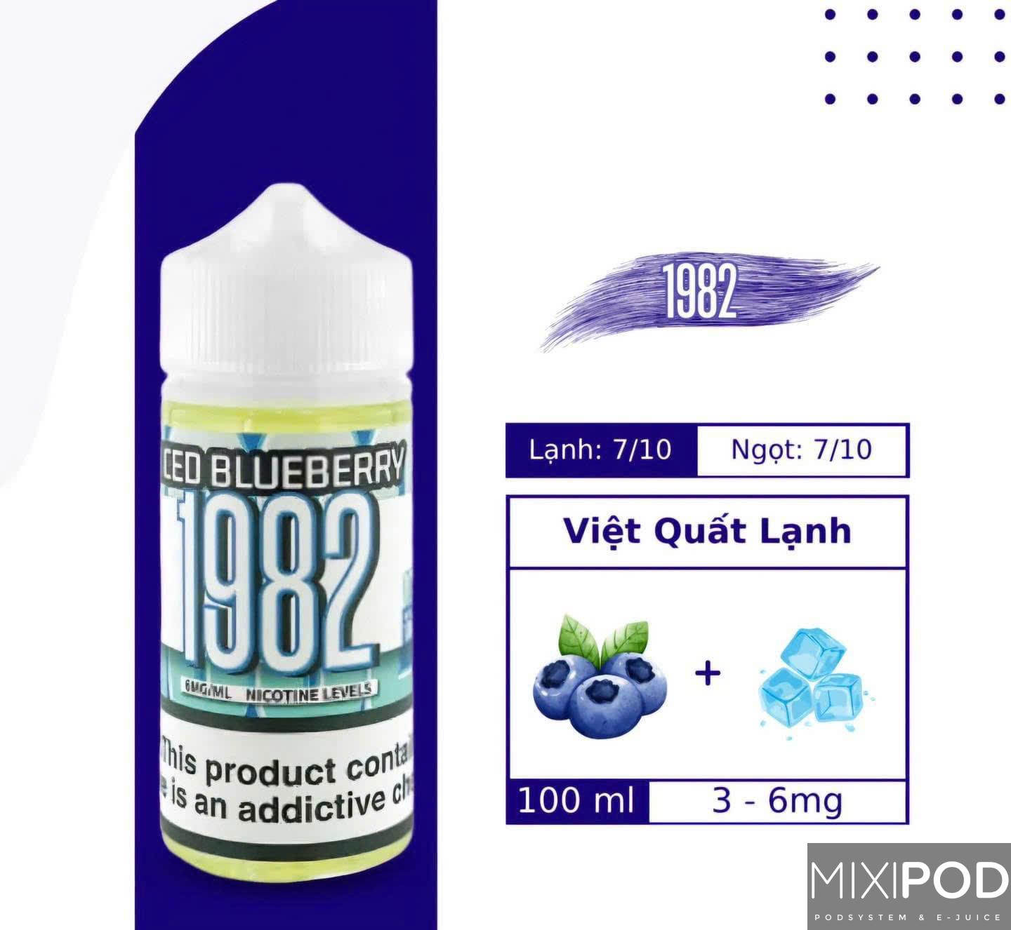 Là dòng Juice Freebase nhà 1982 mang hương vị đặc trưng của những trái việt quất chín. Trong mỗi làn hơi vaping, anh em sẽ cảm nhận được vị việt quất thơm lừng và độ the mát nhẹ đọng lại nơi đầu lưỡi và hậu vị. Nếu muốn vaping một các vừa phải, thư giãn, anh em có thể thử nồng độ 3ni của 1982 Iced Blueberry – vị Việt Quất. Ngoài dòng Freebase, 1982 cũng phát triển vị Juice Salt Ice Blueberry với nồng độ 35ni và dung tích là 30ml để phục vụ nhu cầu đa dạng của cộng đồng vaper.
