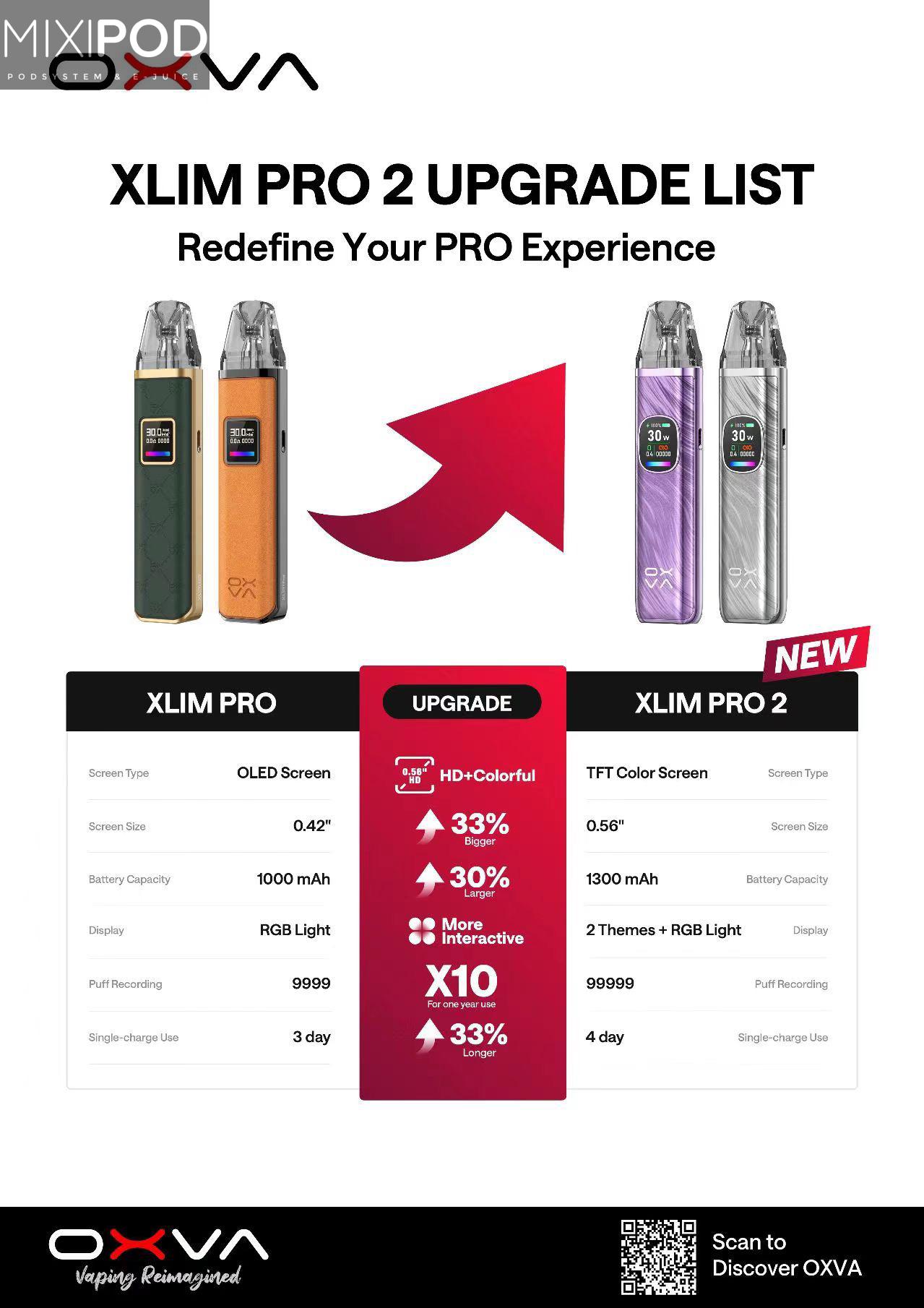 Xlim Pro 2 vượt trội với công nghệ hiện đại và hiệu năng mạnh mẽ hơn. Pin dung lượng lớn đến 1300mAh, có thể nói đây là điểm sáng vượt trội hơn nhiều so với phiên bản Xlim Pro. Dung lượng pin lớn cho thời gian sử dụng lâu hơn. Có thể tối đa đến 4 ngày mà không cần cắm sạc. Công suất của dòng này cũng được nâng cấp cao hơn giúp tạo ra lượng khói nhiều hơn và hương vị phong phú hơn. Hệ thống cảm biến tiên tiến giúp tối ưu hóa quá trình vaping và bảo vệ thiết bị tốt hơn. Xlim Pro 2 cũng có thêm nhiều chế độ vaping khác nhau với đầu rỗng Xlim Pro cho phép người dùng tùy chỉnh trải nghiệm theo sở thích cá nhân.